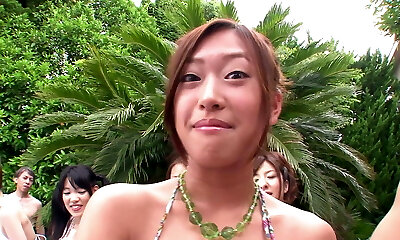Four Japanese dudes fuck sex-appeal Japanese breezies in the pool